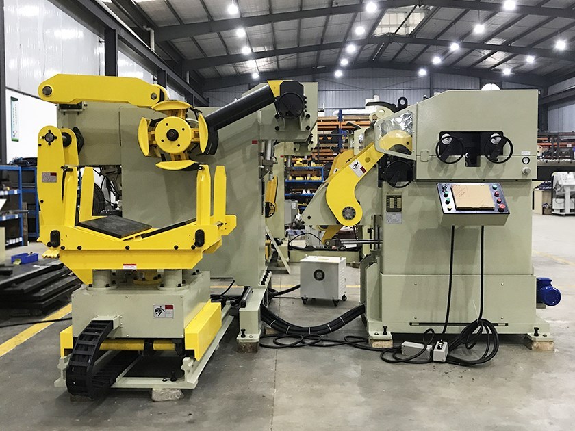 Decoiler straightener feeder machine equipped with press for LED metal parts stamping. It suits for metal steet sheet coil in a automatic feeding line.